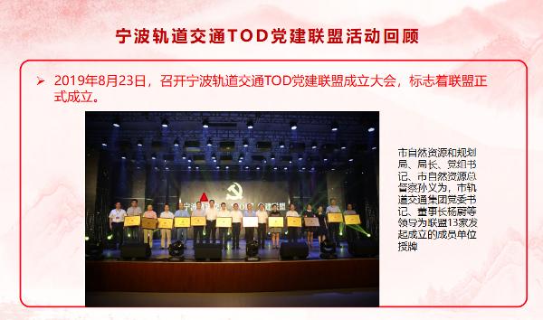 寧波軌道交通TOD黨建聯(lián)盟以TOD助推城市發(fā)展為目標,以軌道交通物業(yè)開(kāi)發(fā)為主體,聯(lián)動(dòng)沿線(xiàn)致力于軌道建設、城市開(kāi)發(fā)的相關(guān)基層黨組織。2019年8月成立以來(lái),通過(guò)資源共享、聯(lián)學(xué)互動(dòng),初步形成“共建、共創(chuàng )、共享、共贏(yíng)”氛圍,黨組織、黨員的戰斗堡壘和先鋒模范作用有效發(fā)揮。